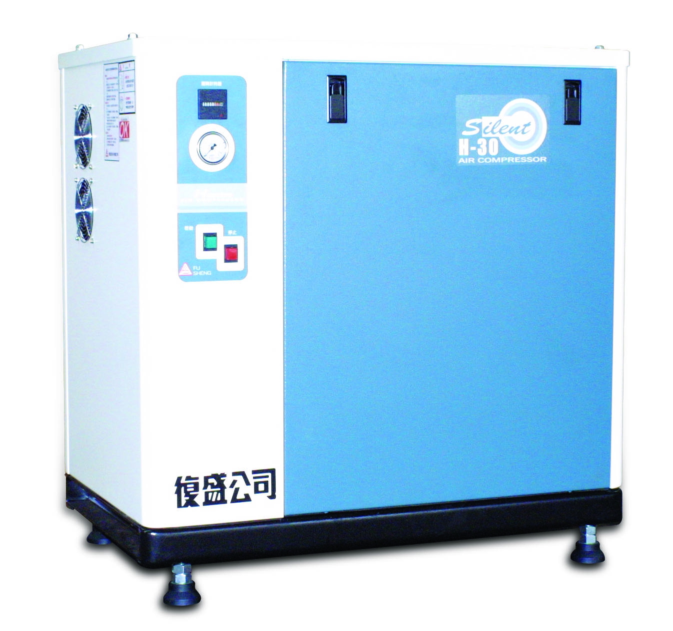 復盛H系列靜音型氣冷微油式空壓機,提供平穩低震動及靜音的運轉,而且散熱效果佳,使空氣出口溫度低,根本無需額外冷卻,適合長時間運轉。另外,整體設計佔地面積小,安裝簡便。門扣化的設計減少螺絲量,使維護保養更容易。H系列還附有充油式壓力錶與運轉計時器。高低調整腳座的設計適合於各種不平地面。可調全自動控制而且容易操作。